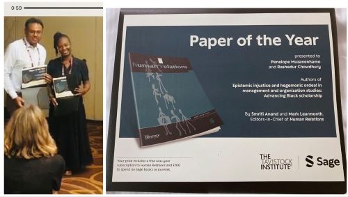 Dr Muzanenhamo co-authored this award winning research with Professor Rashedur Chowdhury, University of Essex, UK. They both received Human Relations Paper of the Year 2023 award at the Academy of Management 83rd Annual Conference, August 2023, in Boston, Massachusetts, USA.
